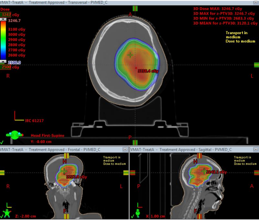 在该阶段放疗计划执行期间,小倩曾一度出现高热、喉部吸出大量黄色黏稠痰的症状,由于长期卧床又曾有大量激素冲击治疗,肺部影像学也提示肺部重症感染。为了更好解决这个问题,经讨论决定后,将小倩的化疗强度减弱,逐步降低激素的使用强度,同时配合抗细菌及抗真菌治疗。功夫不负有心人,小倩肺部感染的情况好转。在科室持续近一个月的治疗后,第一期的15次放疗计划顺利完成,小倩的状态也由深昏迷转为嗜睡,肿瘤大小缩退明显。好转的情况让小倩的父母非常高兴,也更加积极配合治疗。为了更好地保护患者的脑组织,石兴源主任建议重新定位,缩野放疗,在二段放疗计划中,照射野面积大大减少,也大大降低对正常脑组织的剂量限制。