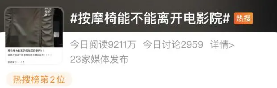 8月7日,“按摩椅能不能离开电影院”的话题登上了微博的热搜。不少网友在话题下“吐槽”——“不喜欢”“完全没必要”。