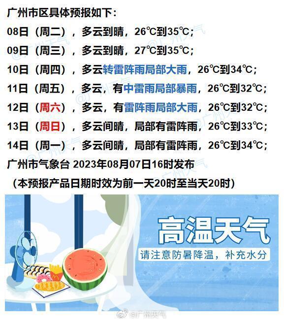 但立秋不等于入秋。立秋当天并不是酷热与凉爽的分水岭,立秋并不代表酷热天气就此结束。立秋还处在暑热时段,尚未出暑,到处暑节气才出暑。据天气预计,未来几日广东温度继续“炎值”爆灯,但还需警惕局地强降水及其引发的城乡内涝、山洪、泥石流和山体滑坡等次生灾害。广州方面,周二周三晴热为主,方便晾晒,周四起雷雨活跃,好消息是雨水会让气温略降。