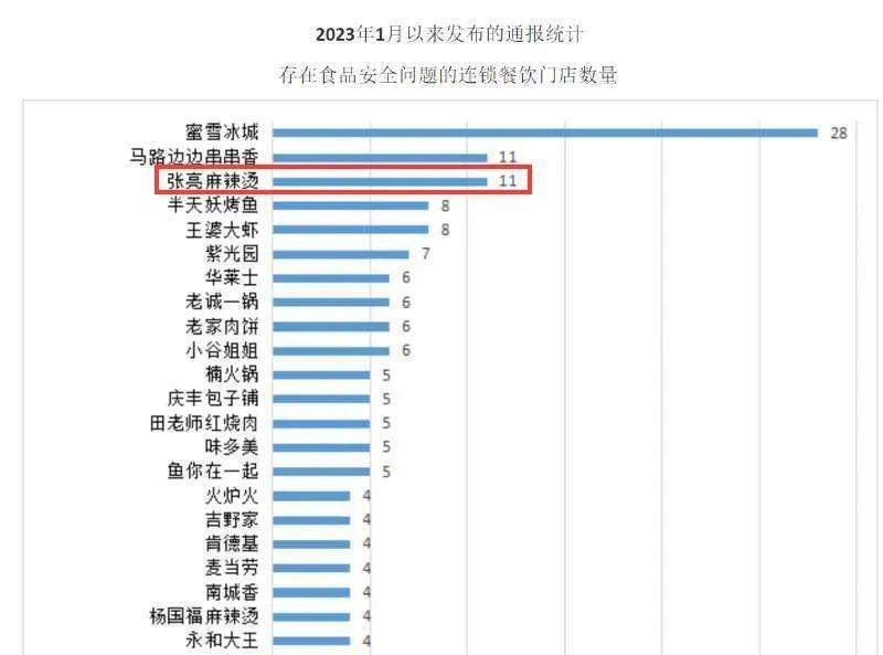今年7月28日,北京市消费者协会发布的《2023年北京市餐饮企业食品安全大检查》显示,根据北京市、区市场监管局发布的食品安全问题情况通报统计,2023年1月以来,张亮麻辣烫存在食品安全问题的门店多达11家。