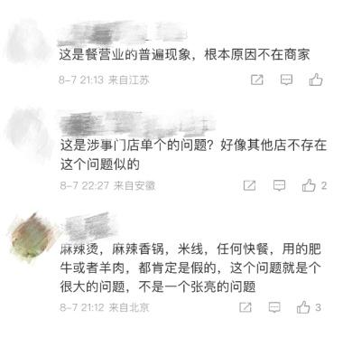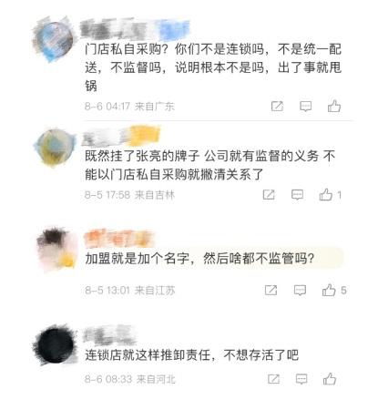 但这一处理结果随即在网络上引发争议。有网友表示,既然挂了张亮麻辣烫的牌子,公司就有监督的义务,不能因为是加盟店、以“门店私自采购”为理由就撇清关系。