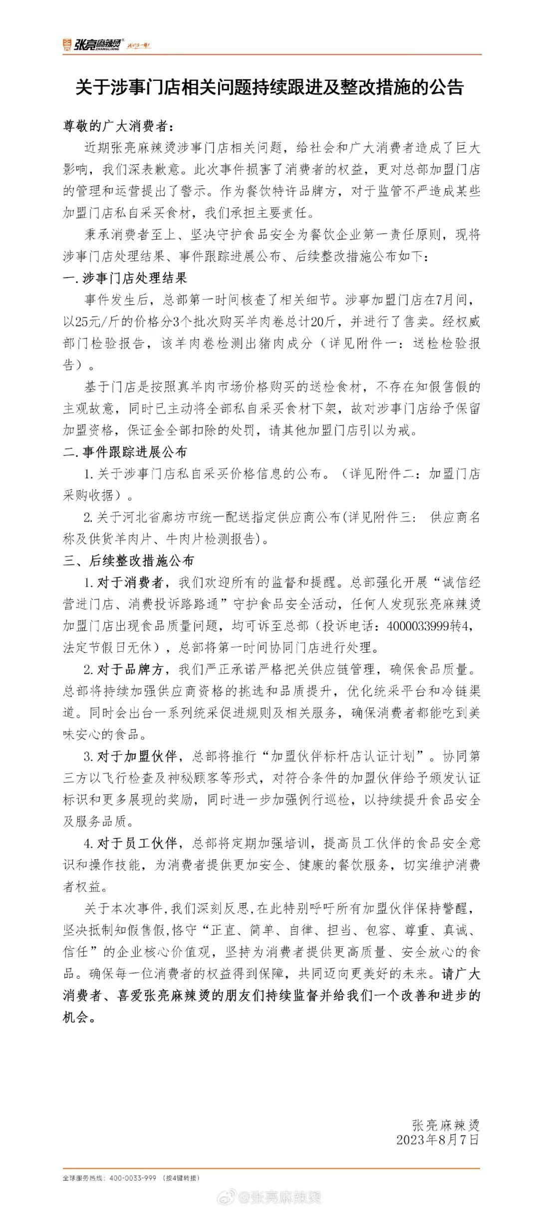 8月7日,张亮麻辣烫再次发布公告,表达道歉的同时还披露了事件细节及整改措施。