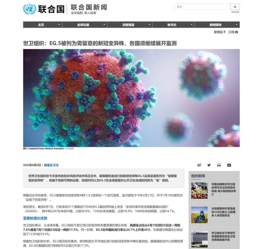 世界卫生组织表示,从全球来看,EG.5相较于其它流行的变异株有着显著的增长优势,其感染占比从6月19日到25日这一周的7.6%增至7月17日到23日这一周的17.5%。同一时期,EG.5在中国的流行率从24.7%上升至45%,在美国与韩国也分别达到了12.8%和19.3%。