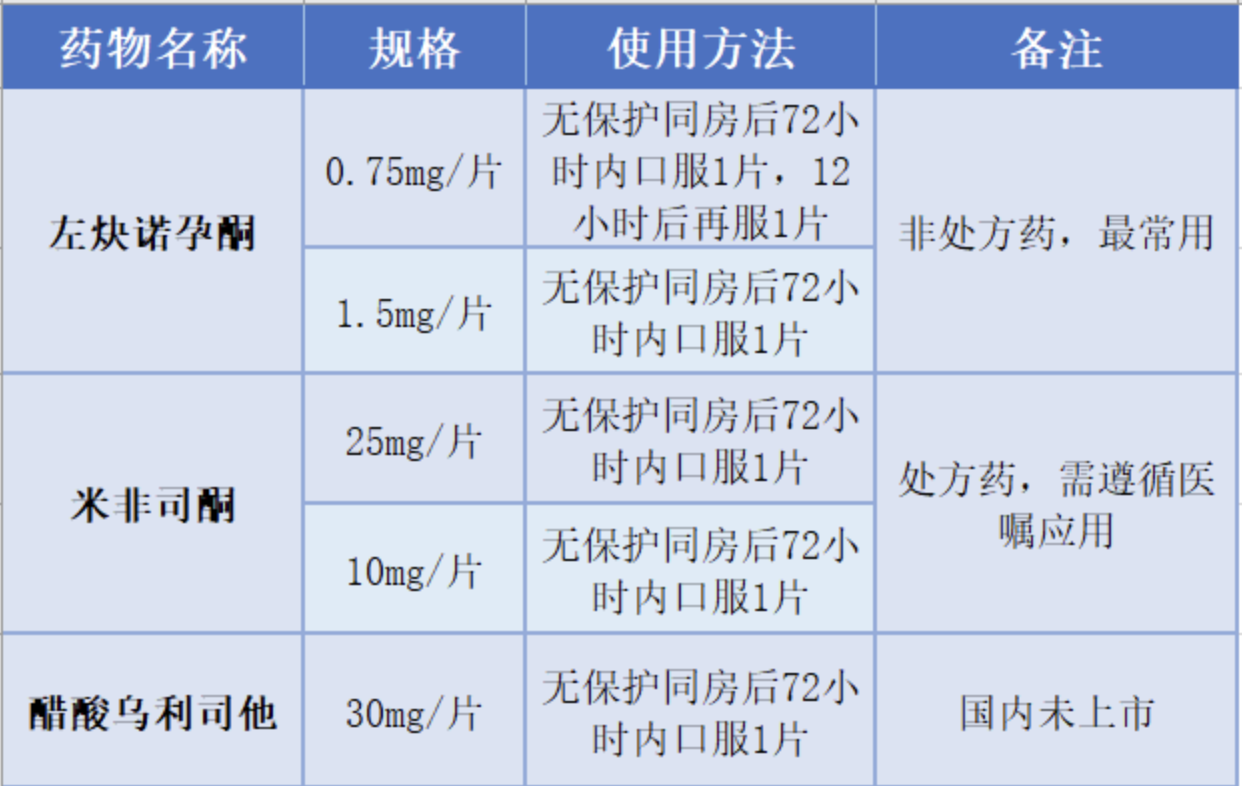 目前,国内常见的紧急避孕药有两种:左炔诺孕酮类和米非司酮类,具体使用方法如下: