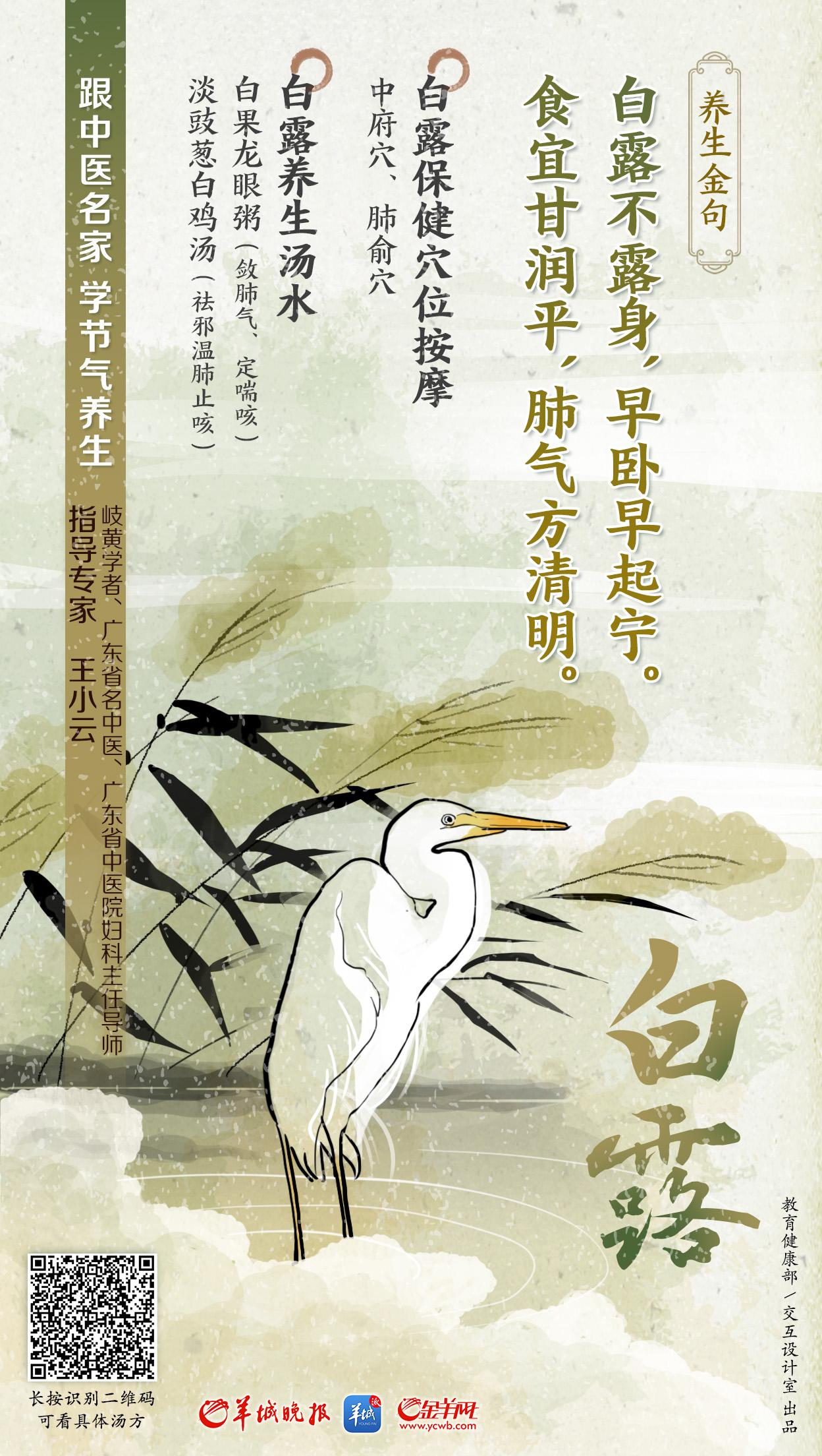 “蒹葭苍苍,白露为霜。”露白秋凉,如何养生?“白露不露身,早卧早起宁。食宜甘润平,肺气方清明。”岐黄学者、广东省名中医、广东省中医院妇科王小云教授给出四句白露养生金句。