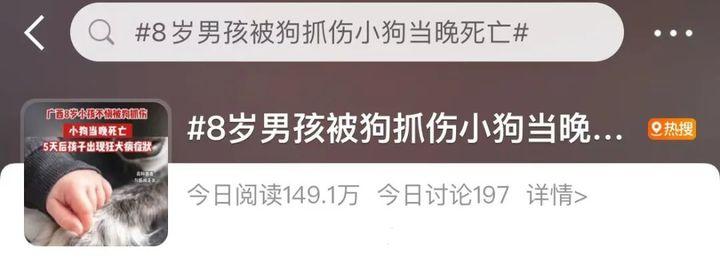 就在今年的4月11日,广西一8岁男孩被狗抓伤右手背后,家属未做相应处理。当天晚上,狗已死亡。5天后,男孩出现了发热、四肢抖动等症状,去当地县医院住院治疗,被确诊为狂犬病,最终因抢救无效死亡。从男孩被狗咬伤到发病、死亡,仅20天时间,令人无比痛心。