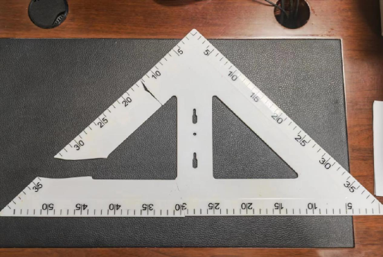 记者从家属处获得一张疑似凶器的三角尺图片,尺子为白色,三面长度为35厘米,已经断成了三节,在左下角有明显的缺失。