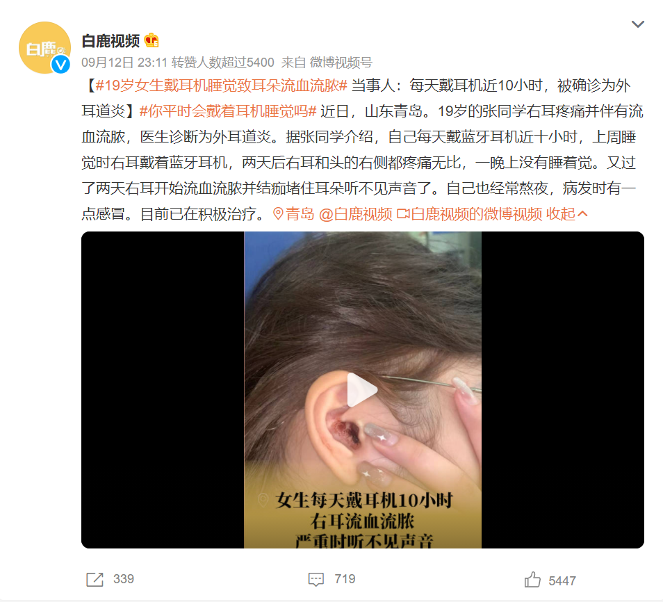 据媒体报道,近日,山东青岛19岁的女生张同学右耳疼痛并伴有流血流脓,医生诊断为外耳道炎。张同学自述,自己每天戴蓝牙耳机近十小时,上周睡觉时右耳戴着蓝牙耳机,起床之后就有些疼。两天后,耳朵连着下颚、右脑疼痛难忍,后来右耳开始流血、流脓,听不见声音了。张同学说自己也常熬夜,病发时有一点感冒,目前已在积极治疗。