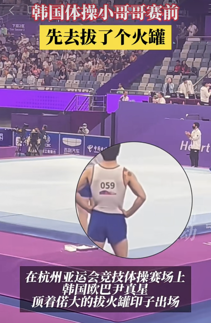 时隔7年,杭州亚运会体操比赛现场,这股神秘的东方力量再次出现了!韩国体操运动员尹真星顶着偌大的拔罐印子出现在了赛场上,队友称这是他到杭州亚运村之后拔的。