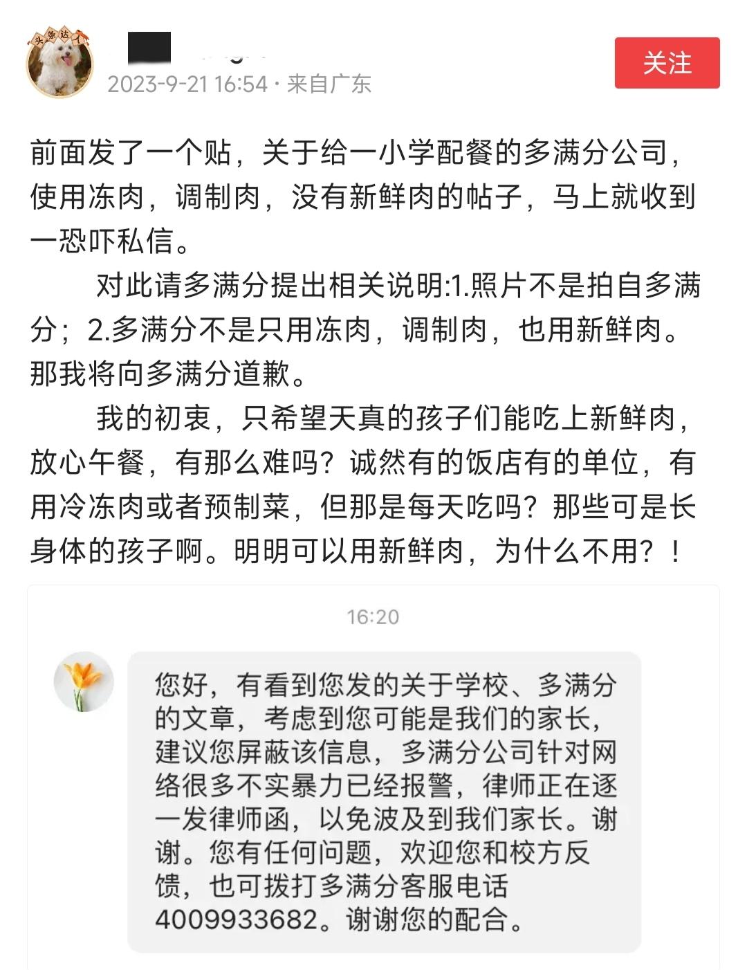 近期,学校午餐问题持续引发关注。一博主发布消息称,广州市黄埔区天誉小学配餐公司使用冻肉、调制肉制作午餐。该消息发布后,这名博主收到了一条私信,要求其屏蔽该消息。