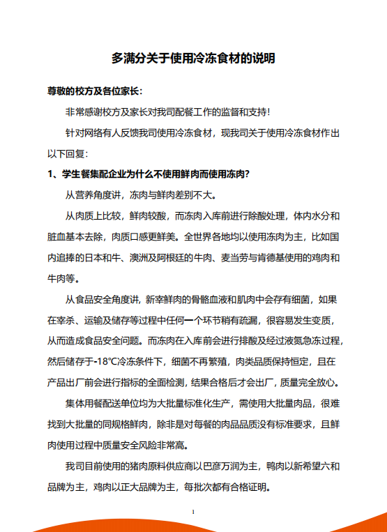不过,涉事学校9月22日发布声明称,对于网传天誉小学的配餐单位多满分公司使用冻肉制作午餐的情况,学校迅速开展了核查。