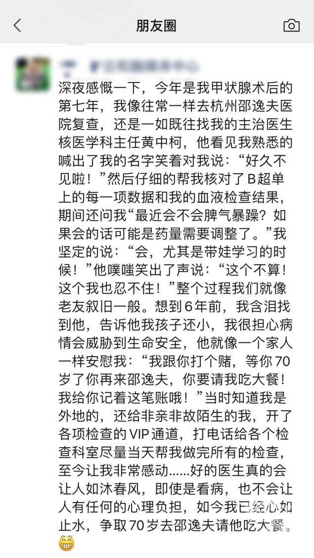 因为一句半开玩笑的约定,浙大邵逸夫医院核医学科黄中柯主任医师和甲状腺癌患者汪女士开启了长达6年多的友谊。