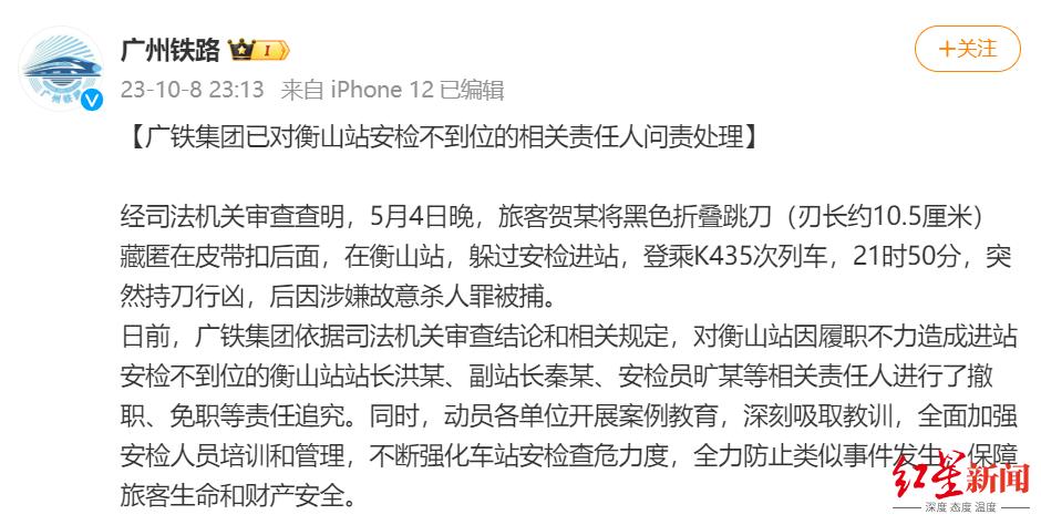 据广铁集团官方微博10月8日深夜通报,2023年5月4日晚,旅客贺某将黑色折叠跳刀(刃长约10.5厘米)藏匿在皮带扣后面。在衡山站,贺某躲过安检进站,登乘K435次列车。当晚21时50分,贺某突然持刀行凶,后因涉嫌故意杀人罪被捕。被贺某杀害的乘客谷巩,年仅27岁,是名舞者。据谷巩的亲属告诉记者,当晚,当K435次列车行驶至湖南省衡山县到衡阳市之间时,贺某突然持刀行凶,谷巩的母亲吴某英和谷巩同行,目睹了儿子遇害的经过。