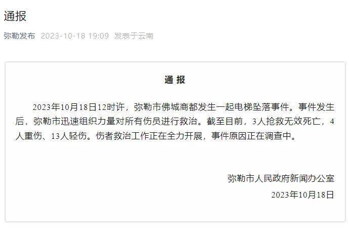 据云南省弥勒市人民政府新闻办公室消息,10月18日12时许,云南省弥勒市佛城商都发生一起电梯坠落事件。事件发生后,弥勒市迅速组织力量对所有伤员进行救治。截至目前,3人抢救无效死亡,4人重伤、13人轻伤。伤者救治工作正在全力开展,事件原因正在调查中。