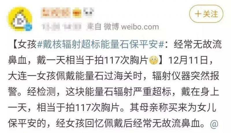 一些能量石里含有放射性物质(铀-238、钍-232、镭-226等),且都会通过衰变产生电离辐射,经常佩戴相当于拍了117次胸片。