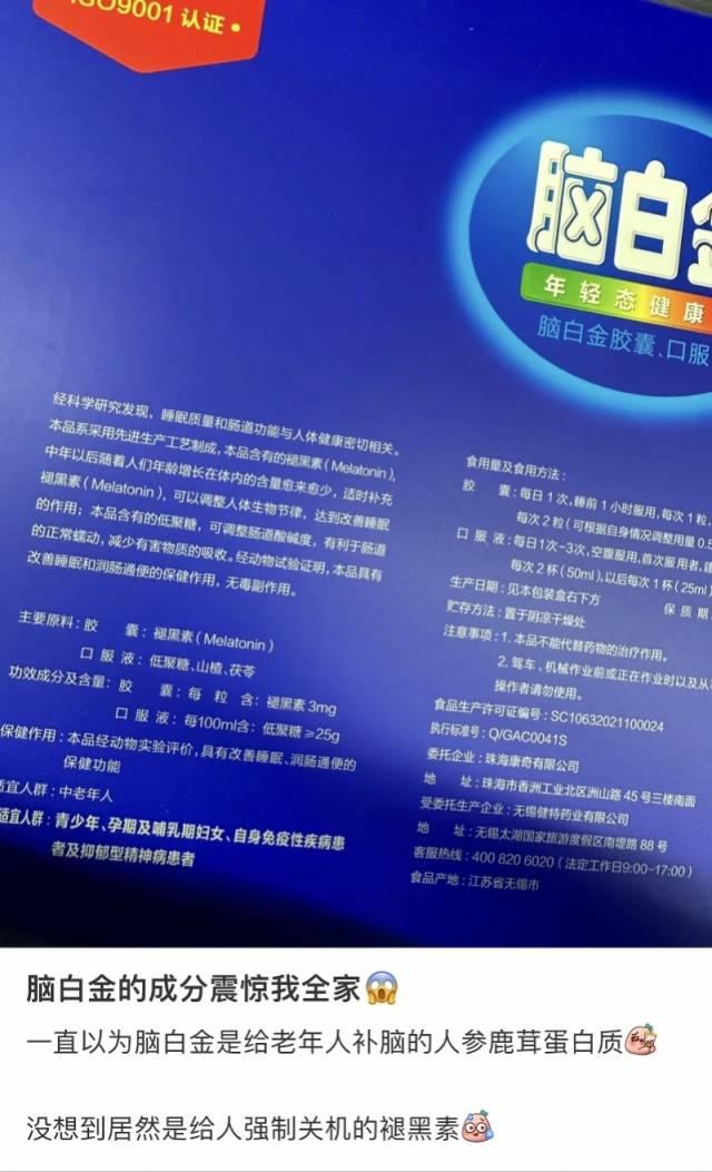 10月10日,江西一网友发帖表示,“一直以为脑白金是给老年人补脑的人参鹿茸蛋白质,没想到居然是给人强制关机的褪黑素。”
