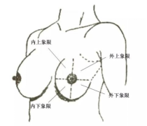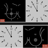 即描述该病变位于乳房的方位,一般以乳头为圆心,把乳房看成是时钟,12点位置为人体的正上方,6点钟则对应人体的正下方。描述病变处于乳房的几点钟方位,并描述病变与乳头的距离来确定位置。另一种方法比较笼统,以乳头为中心,把乳腺分为内上、内下、外上、外下四个方位来描述病变的位置。