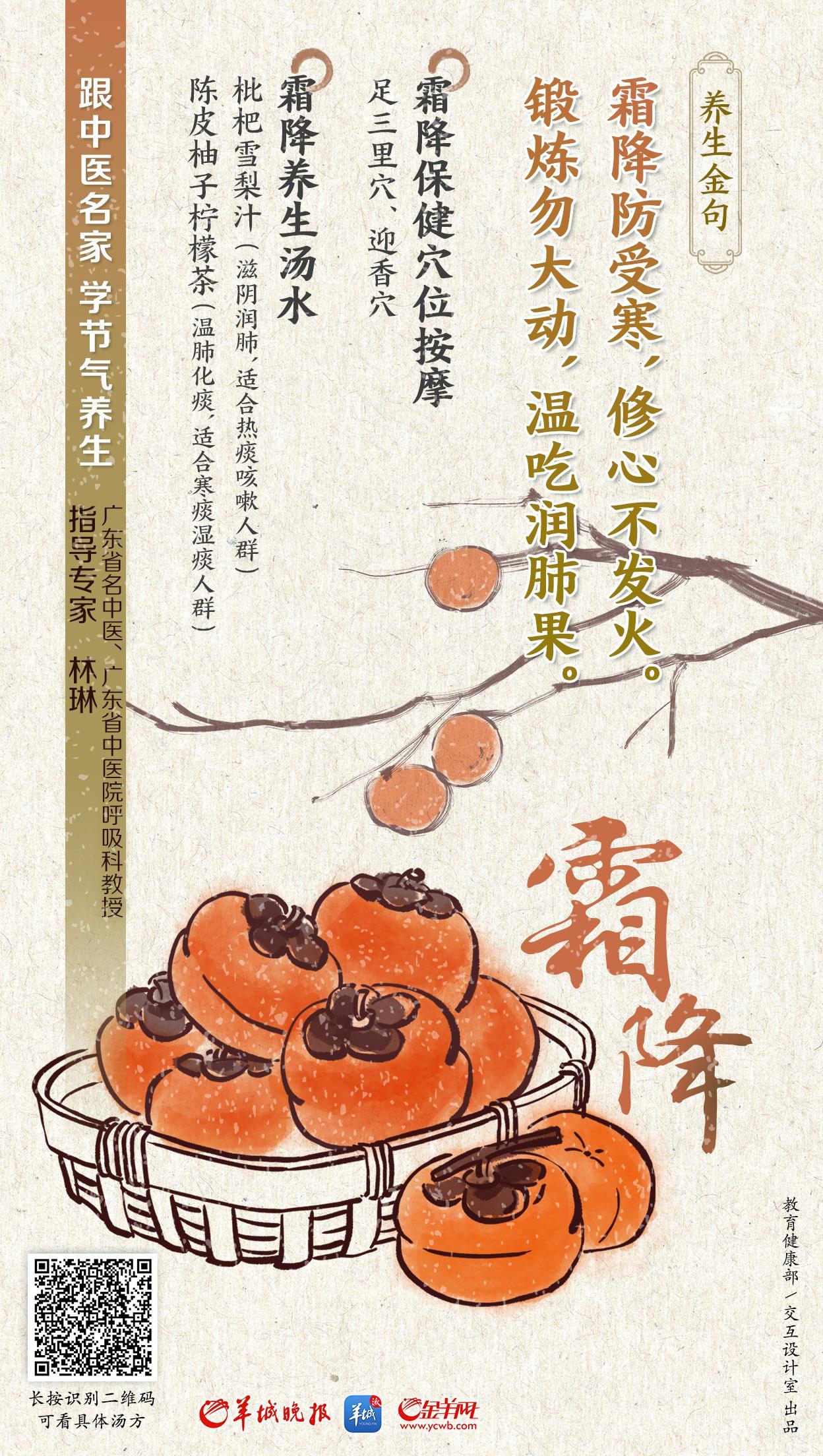 10月24日是霜降节气,霜降是二十四节气中第十八个节气,也是秋季最后一个节气,此后便逐渐转入冬季。此时应如何养生保健?“霜降防受寒,修心不发火。锻炼勿大动,温吃润肺果。”广东省名中医、广东省中医院呼吸与危重症医学科大科主任林琳教授给出四句霜降养生金句。