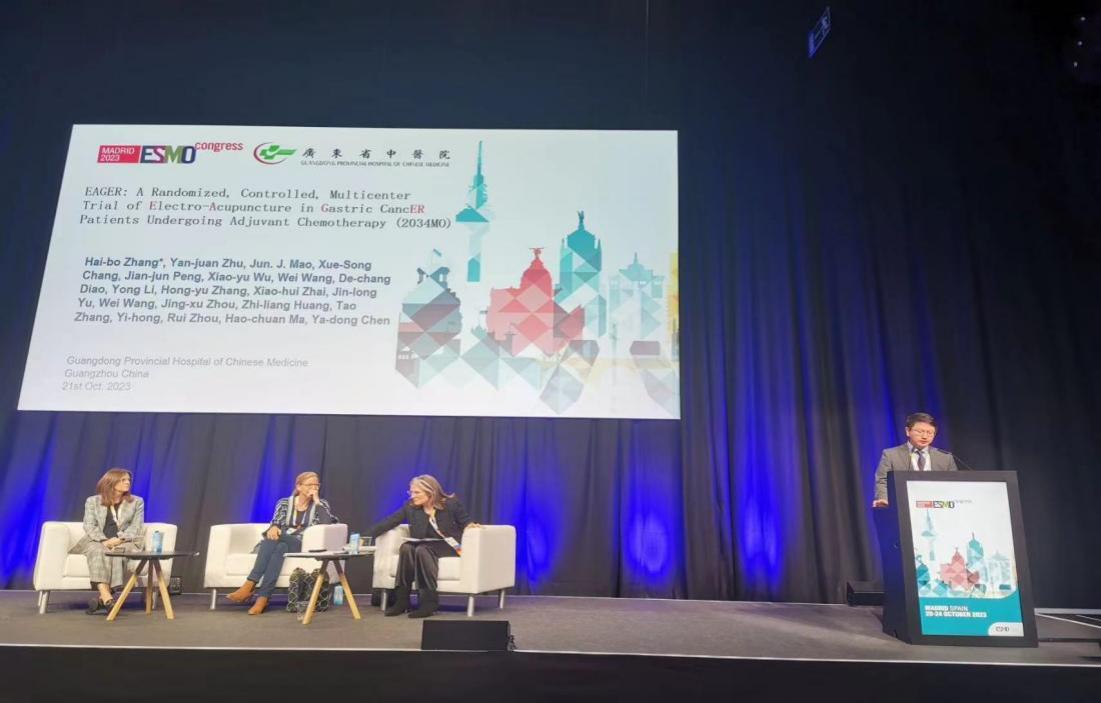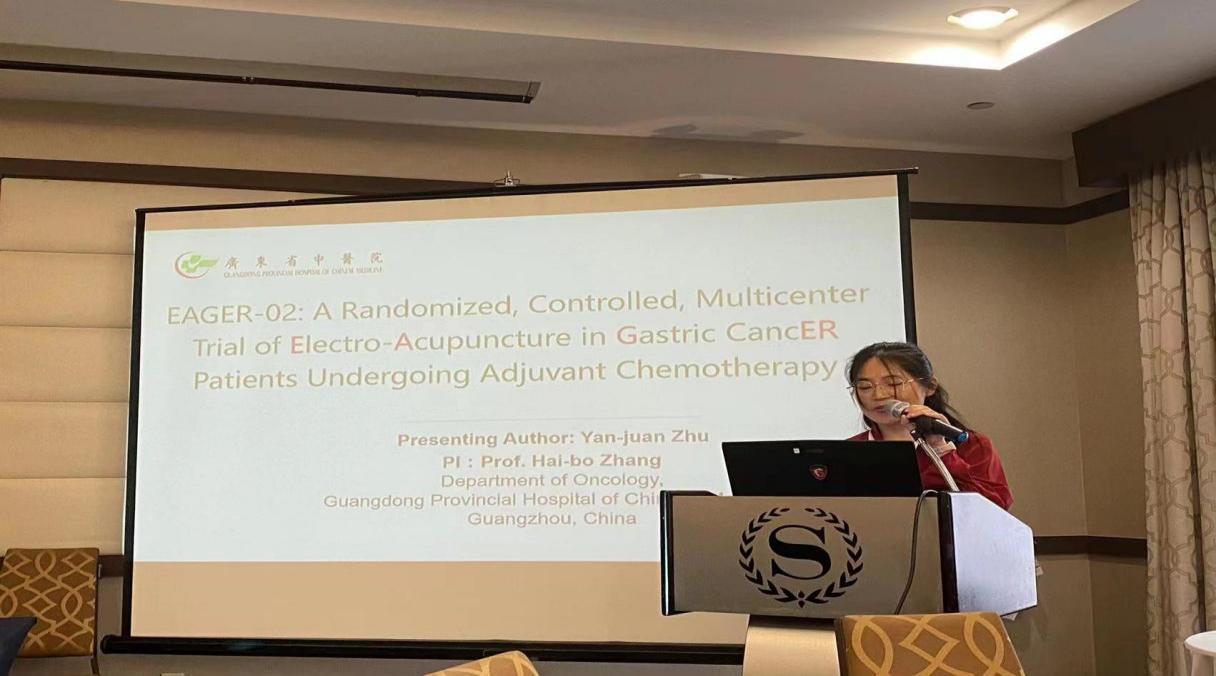 10月21日,广东省中医院(广东省中医药科学院、广州中医药大学第二附属医院、中国中医科学院广东分院)肿瘤科大科副主任张海波教授在大会上进行了题为“电针用于胃癌辅助化疗患者的随机、对照、多中心临床研究”(EAGER: A Randomized, Controlled, Multicenter Trial of Electro-Acupuncture in Gastric Cancer Patients Undergoing Adjuvant Chemotherapy)的口头报告。