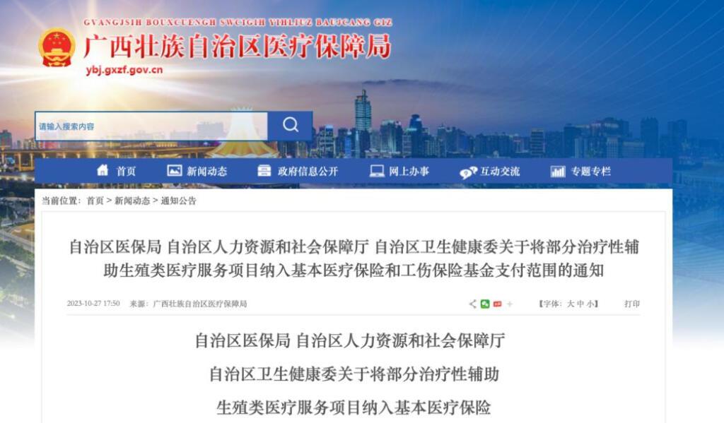 “11月1日起,取卵术等部分治疗性辅助生殖类医疗服务项目纳入基本医疗保险和工伤保险基金支付范围。”据广西壮族自治区医保局消息,符合治疗条件的参保人员每个治疗性辅助生殖医疗服务项目及相关加收项目报销2次,基本覆盖每位参保人员2个辅助生殖移植周期治疗费用,职工基本医疗保险、城乡居民基本医疗保险报销比例分别为70%、50%。