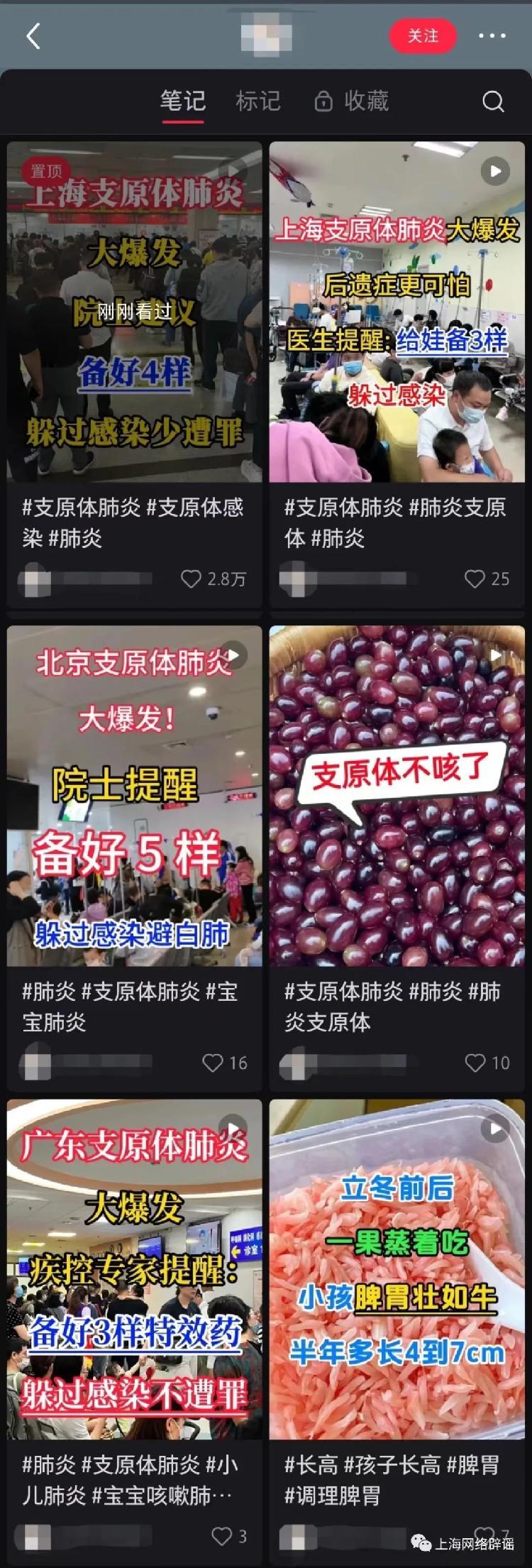 点进该博主主页可以发现,其发布了多篇与支原体肺炎相关的视频,标题中不仅有“上海支原体肺炎大爆发”,还有“北京支原体肺炎大爆发”“广东支原体肺炎大爆发”等,内容大同小异,套路如出一辙。而其在视频最后都会推荐如益儿辛、沙芽红果饮等保健食品,有带货嫌疑,这样打着院士旗号的“科普博主”不可轻信。