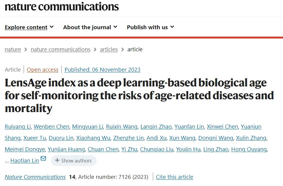 近日,国际高水平期刊Nature Communications(中科院一区)在线发表了由中山大学中山眼科中心林浩添教授团队主导的一项最新研究,文章指出,我们的重要视觉结构——晶状体,其在衰老过程中呈现出特征性变化,例如出现最常见的年龄相关性白内障,且患有糖尿病等年龄相关性疾病的个体发生白内障的时机要更早。再加上晶状体在解剖位置上处于眼前段,其特征可被非侵入性的影像学检查客观、快速地记录。因此,研究团队认为,晶状体可作为评估个体生物学年龄和衰老的重要窗口,并首次提出了可准确反映机体衰老水平的“晶状体年龄”。