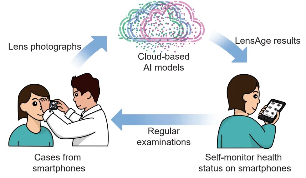 此外,研究团队还将“晶状体年龄”评估技术应用到了手机端,通过手机采集晶状体图像进行智能分析,实现院外场景下衰老水平和疾病风险的自我评估。这种无创、便捷的方法为增龄过程中的健康管理提供了新的方式。