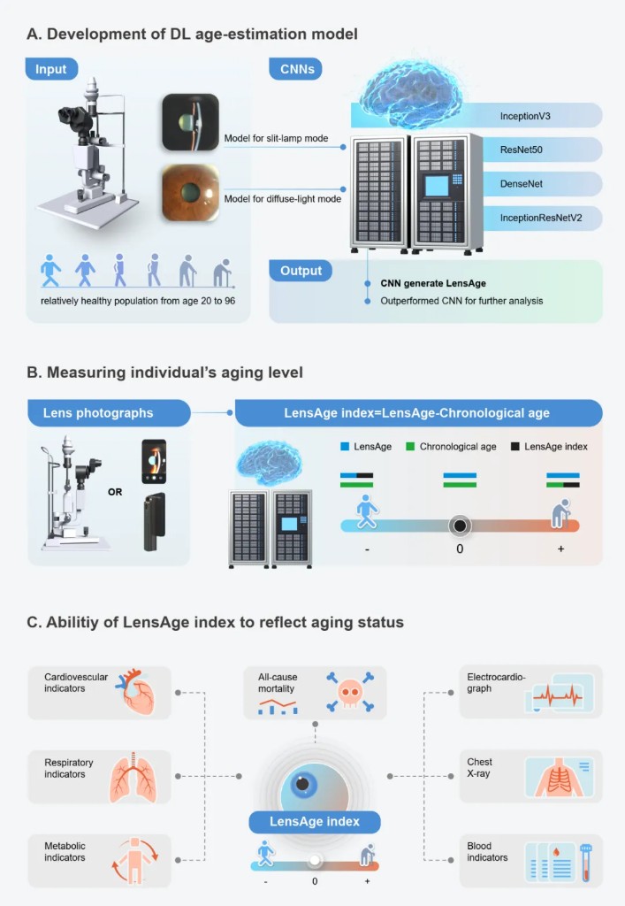 研究团队对此表示,衰老与机体健康状况和疾病发生风险密切相关。机体在衰老过程中,生理功能减退,高血压、冠心病等系统性疾病的患病率增加。因此,评估机体衰老水平对个体健康管理和疾病干预至关重要。在该研究中,为挖掘不同年龄段晶状体组织的关键衰老特征,研究团队基于覆盖20-96岁个体的大样本晶状体图像数据,依托天河二号超算中心训练“晶状体年龄”智能评估模型,并且进一步证明“晶状体年龄”不仅可以揭示视力下降、白内障、玻璃体混浊等眼部衰老,更重要的是能预测糖尿病、高血压、冠心病、癌症等年龄相关性系统性重大疾病发生的风险。