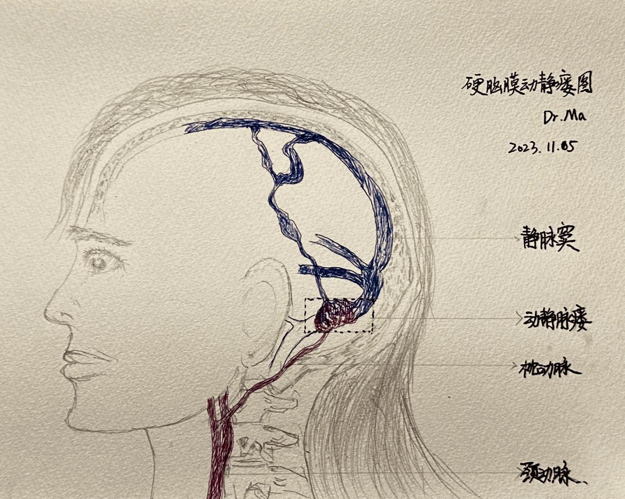 “硬脑膜上是有血管的,在某些外伤或者炎症的情况下,动脉和静脉之间的毛细血管扩张,导致动脉和静脉直接‘沟通’了。”马朝晖生动地解释,由于静脉压力低,动脉血就“呼呼”地往静脉跑,造成了静脉的迂曲扩张,也造成了动脉血的“盗流”,就像被人偷走了一样。由于动静脉瘘的瘘口窄,当通过的血流量大速度快,就像风穿过峡谷一样,所以患者就会听到“呼呼”的风声,这也是硬脑膜动静脉瘘的主要症状之一。