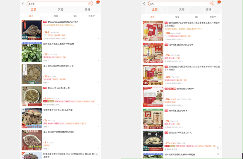 记者尝试在购物平台输入“土三七”和“三七”搜索发现,这两款中药材目前均有售卖。但仍能在“土三七”的搜索结果中发现售卖“三七”的店家,如不仔细辨认,很难分清。