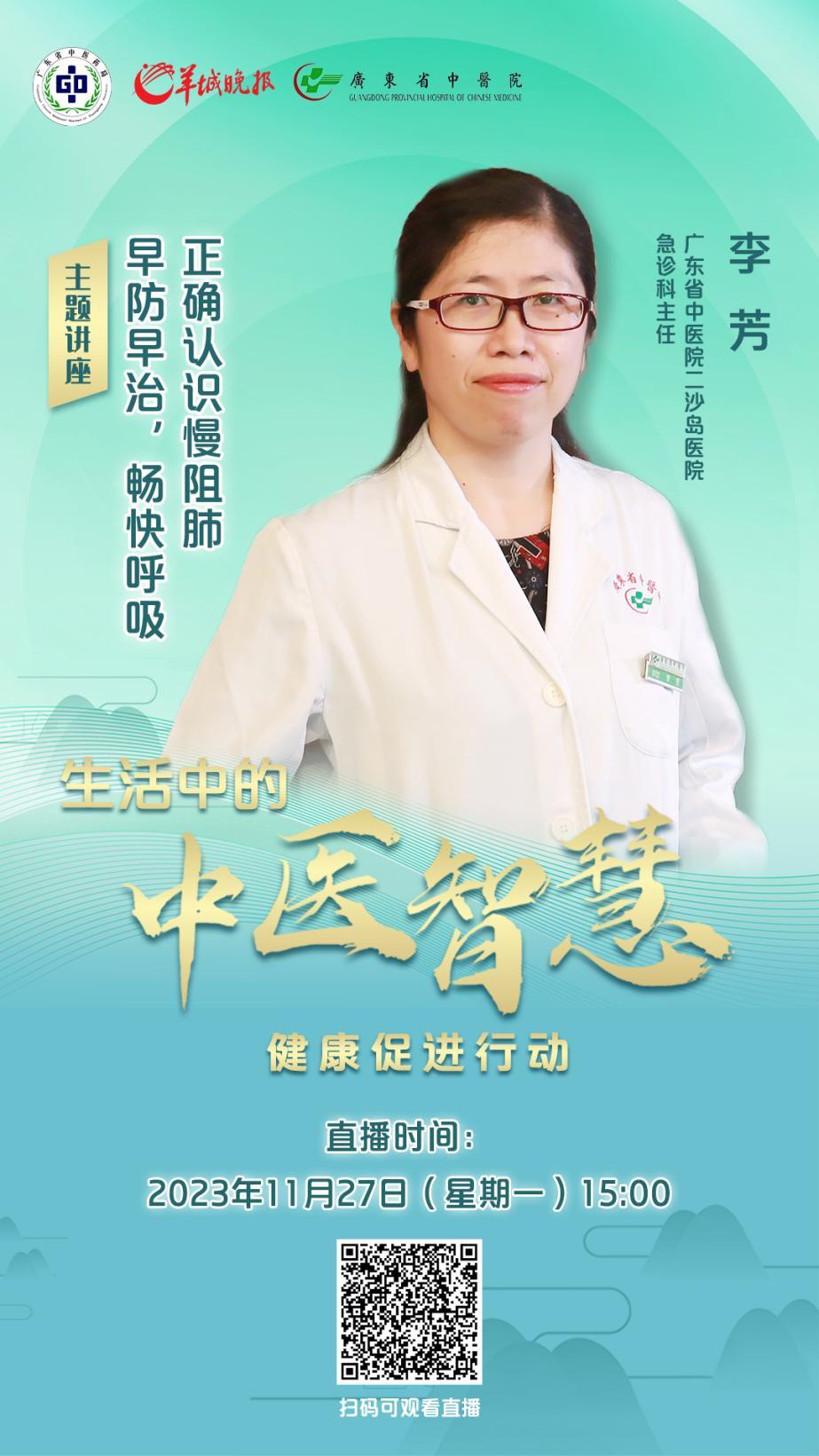 针对大众关注的冬季呼吸道养护问题,活动现场,广东省中医院二沙岛医院急诊科主任李芳将带来《正确认识慢阻肺,早防早治,畅快呼吸》主题讲座,教你轻松应对呼吸问题!羊城晚报羊城派直播间将进行现场直播,云上共享科普知识。