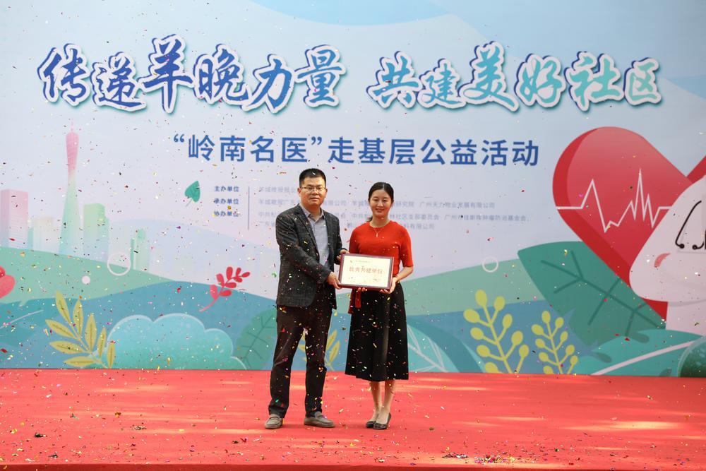 活动中,羊城晚报广东金羊发行有限公司总经理助理张永生向天力物业华南区域运营总监罗雪芬颁发了优秀共建单位牌匾。