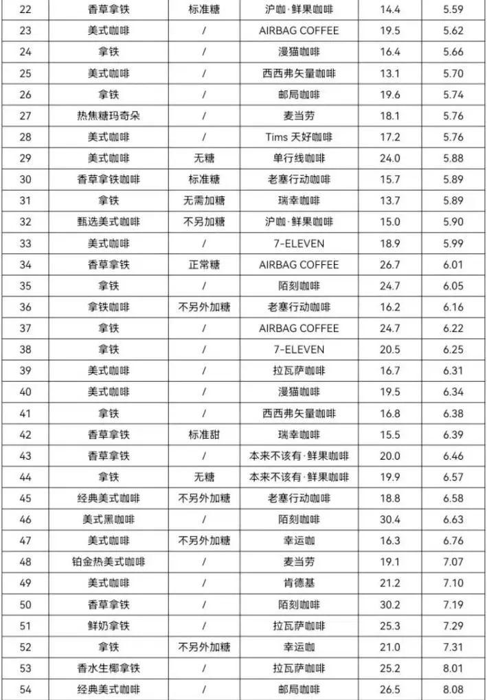 在本次59款样品中,能量检测结果有高有低,其中一杯咖啡能量高于一个成年女性一天所需能量的1/6;样品中有2款美式咖啡和2款拿铁标称为“无糖”,但经检测,其中2款拿铁样品含糖量超过标准对“无糖”规定的最高限量值;咖啡因检测显示其中4款样品的咖啡因含量低于200mg/kg,在提神作用上略显逊色;值得注意的是,在本次59款样品中均检测出低含量的2A类致癌物“丙烯酰胺”(目前我国暂未对咖啡中丙烯酰胺有限制性或禁止性规定)。