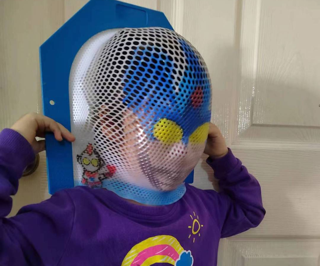 但因为头模制作过程中模具会浸泡在热水中加温重塑,当温度较高的模具贴到脸上时,哪怕是成年人也较难忍受。因此,瑞瑞的第一次配合做头膜就这样宣告失败了。后续尽管给瑞瑞打了麻醉镇静,但当温度接近40℃的头膜贴到脸上时,瑞瑞立马从熟睡中惊醒,嚎啕大哭......
