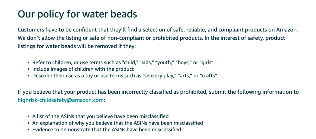 亚马逊公告表示,这类水珠产品是一种高吸水性聚合材料制成的彩色小珠子,其名称多样,例如水球、水疗球等,通常只有一粒绿豆大小,但当遇到水或其他液体后,体积会膨胀上百倍,变成光滑透明的小水球。