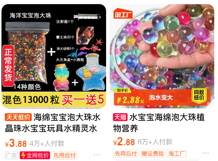 记者发现,这类产品在国内同样有销售,其名称不一,如“水宝宝”“水精灵”“吸水珠”等。记者在多个电商平台搜索“水宝宝”,其中销量最高的累计超10万,据商品详情页,该产品通常采用吸水性树脂制作而成,商家宣称无毒无味,部分页面提示“禁止误食”。