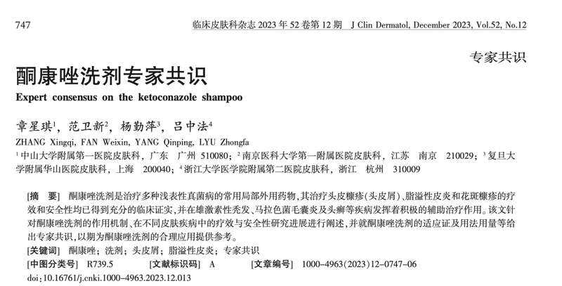 近日,由中国中西医结合学会皮肤性病专业委员会毛发学组四位专家共同编写的《酮康唑洗剂专家共识》(以下简称《共识》)发表于皮肤科中文核心期刊《临床皮肤科杂志》。这是国内首部关于酮康唑洗剂的专家共识,该共识针对酮康唑洗剂的作用机制、临床应用、在不同皮肤疾病中的疗效与安全性研究进展等三维度多方面进行深入阐述,综合已有临床试验证据及临床应用实际,提出酮康唑洗剂的使用建议,旨在为治疗脂溢性皮炎等常见头皮健康问题提供科学的参考依据。