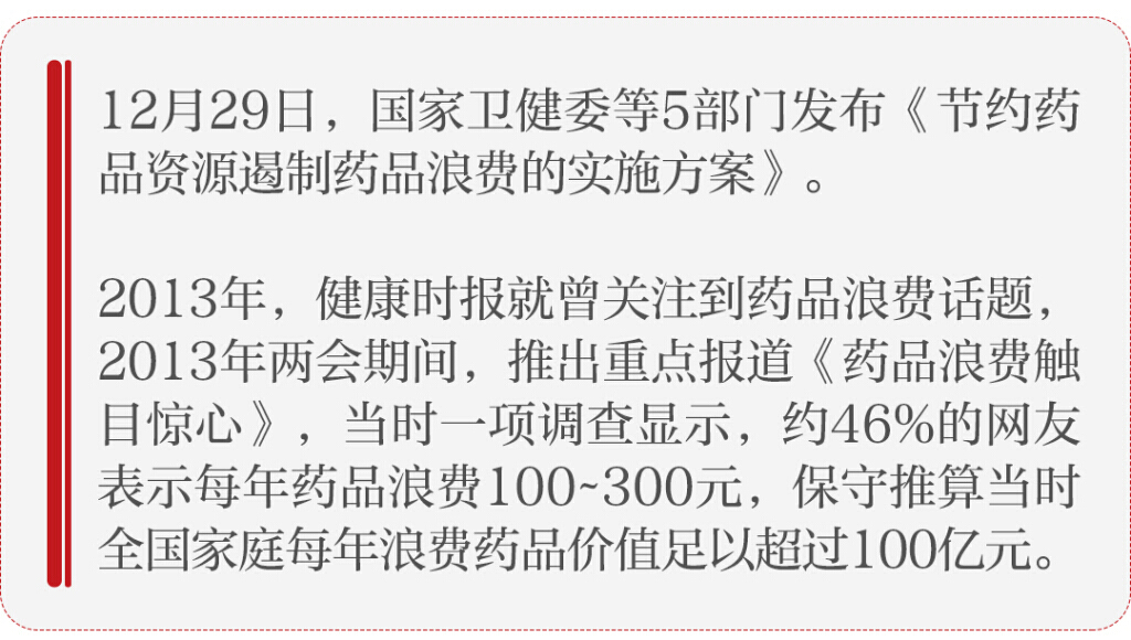 2013年,健康时报就曾关注到药品浪费话题,2013年两会期间,推出重点报道《药品浪费触目惊心》,当时一项调查显示,约46%的网友表示每年药品浪费100~300元,保守推算当时全国家庭每年浪费药品价值足以超过100亿元。医院、药店无法折零售药、造成药品整包销售是造成药品浪费的第一原因。当时全国政协委员、中国中医科学院望京医院骨科教授温建民在2013年两会专门就反对药品浪费、呼吁药品小包装、拆零销售向全国政协提交了《关于遏制药品浪费的提案》。多位专家呼吁,关注药品浪费情况,实施拆零调配药品业务等多措并举,杜绝药品浪费。