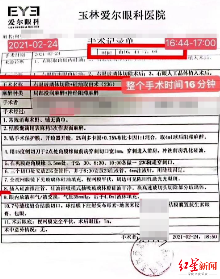1月2日,玉林爱尔眼科相关负责人回复称,目前复杂性视网膜脱离的手术治疗是眼科难度最高的手术之一,也是视力下降和失明的主要原因。其表示,如果首次手术安排了硅油注入以平伏视网膜,则需要二次手术取出硅油,硅油取出术最常见的手术并发症就是硅油残留,因为目前而言硅油注入后是无法完完全全取尽的,“这些情况,玉林爱尔眼科医院在每次手术前,均进行了相关情况的详细告知,患者本人也签署了知情同意书。”