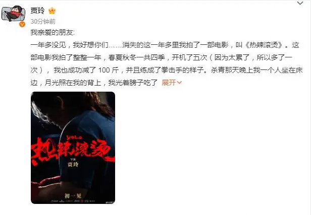 1月11日,许久未露面的导演、演员贾玲发文解释了自己消失1年多里,拍了一部电影,叫《热辣滚烫》,并将于大年初一上映。同时,她还在微博上提到自己为了这部电影减去了整整100斤,网友纷纷震惊。