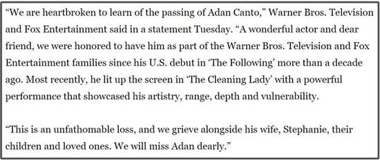 1月10日,华纳兄弟娱乐公司、福克斯娱乐也通过媒体发布了声明:“得知阿丹·坎托去世的消息,我们悲痛万分。他是一位出色的演员和亲爱的朋友,自十多年前他在美国首次在《追随者》中亮相以来,我们很荣幸他能成为华纳兄弟电视和福克斯娱乐大家庭的一员。最近,他在《清洁女工》中以强有力的表演点亮了银幕。这是一个难以估量的损失,我们与他的妻子斯蒂芬妮、他们的孩子和亲人们同在。”