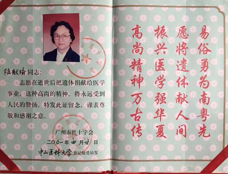 2001年,陆献瑜与廖瑞端母女俩来到广州市红十字会办理了志愿捐献遗体的登记手续。与普通人不同的是,她们俩在各自的申请表备注栏写下三个意见:除捐献角膜移植外,遗体有用的器官均提供给患者做器官移植用;有价值的病变器官供病理教研室做标本;全副骨骼完整地留给人体解剖教研室教学用,并在颅骨刻姓名、性别和死亡年、月、日,以后供考古学参考。亲笔书写,笔迹端端正正。