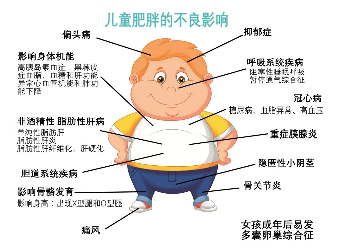 肥胖会带来儿童体型的改变、运动能力下降,以及全身多系统的健康问题。
