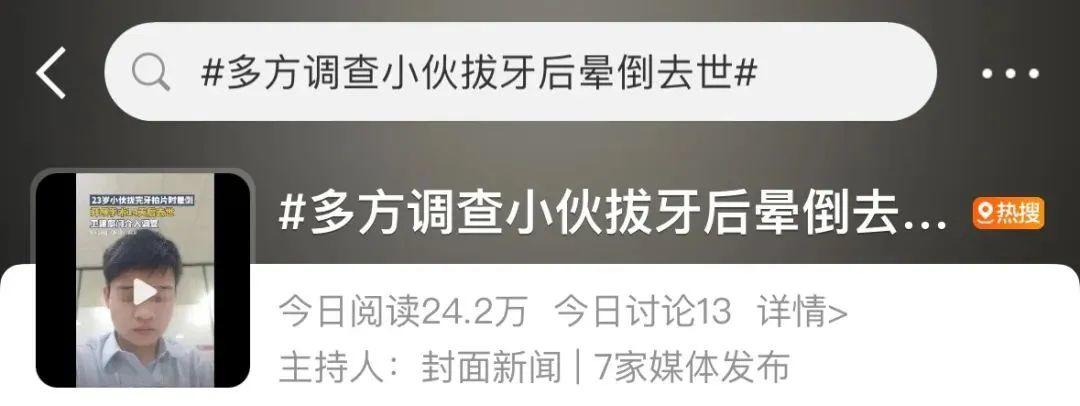 事件曝光后,相关话题 #多方调查小伙拔牙后晕倒去世# 冲上热搜,引发关注。