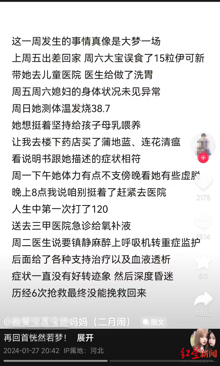 1月22日,周一下午,她体力有点不支,傍晚看她有些虚脱。晚上8点,我说咱别挺着了赶紧去医院。人生中第一次打了120,送去三甲医院急诊,给氧补液。(记者:如果当事人丈夫所说属实,宝妈是在生病第二天晚上就被120拉去医院的。网络上关于“宝妈生病5天没就医去世”的说法是不符合事实的。)