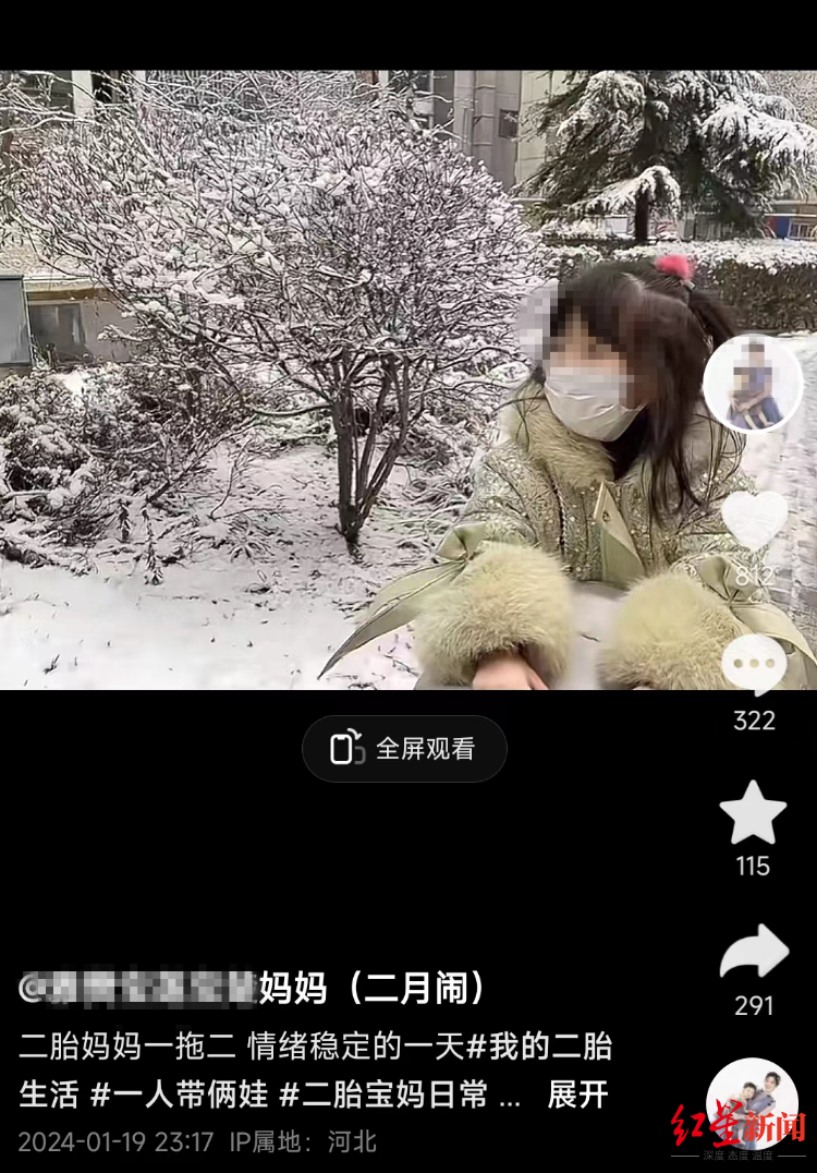 1月19日,发布视频“情绪稳定的一天”。视频中,楼外白茫茫一片,地上有积雪。宝妈带着两姐妹出门看雪。配文:“今天外面下雪了,怎能辜负这场雪呢?”