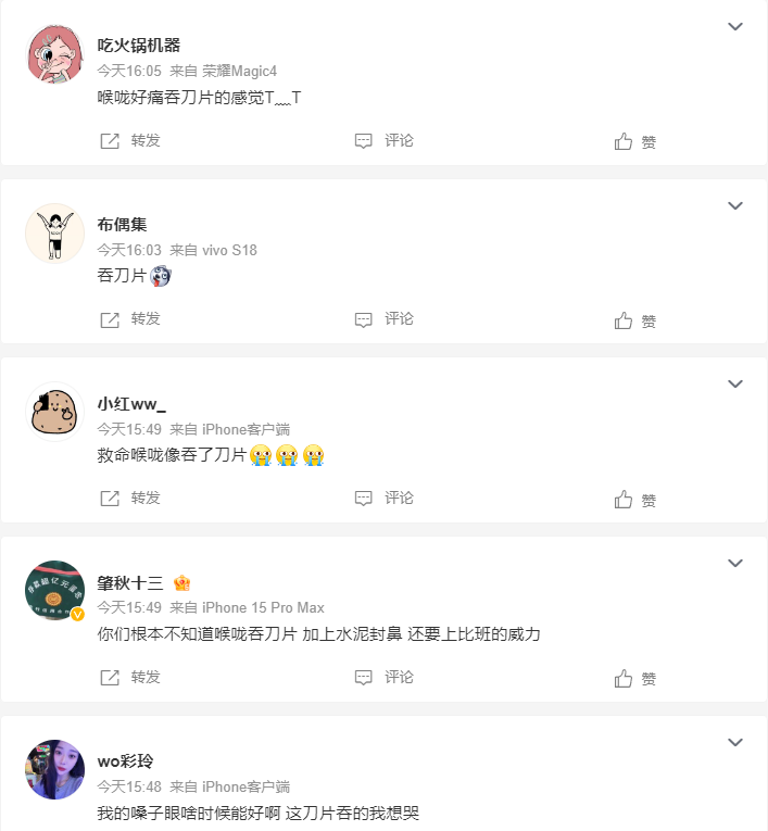 与王媛情况类似的网友在社交媒体上不在少数,甚至有网友表示,“咽喉炎比新冠难受多了”“躲过新冠,没躲过这次咽喉炎”。还有网友称,“下午嗓子干,晚上就直接‘吞刀片’了,浑身酸痛。”“这是专门攻击嗓子的病毒吗?扁桃体都化脓了,咽口水都疼,这都9天了。”