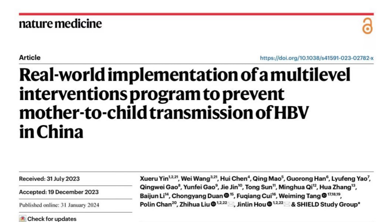 这项成果于2024年1月31日在国际顶级期刊Nature Medicine(最新影响因子82.9 非常高,杂志的影响力在全球前15名左右。)正式在线发表(题为:Real-world implementation of a multilevel interventions program to prevent mother-to-child transmission of HBV in China 《在中国真实世界中实施预防HBV母婴传播的多层次干预方案》)。南方医院感染内科侯金林教授、刘志华主任医师为共同通讯作者,南方医院感染内科尹雪如博士、深圳市宝安区妇幼保健院王维副主任医师为共同第一作者。