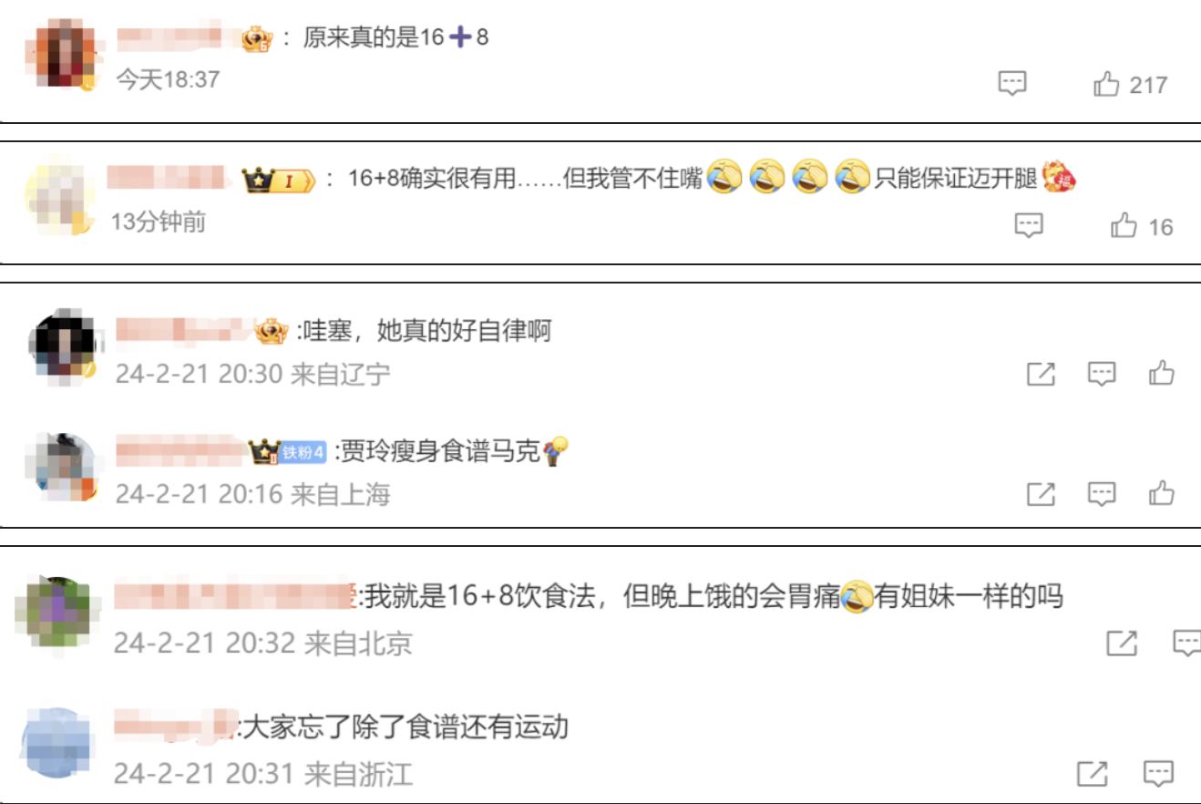 值得注意的是,贾玲一天摄入的食物都尽量在8小时内吃完,遵循着“16+8”原则。