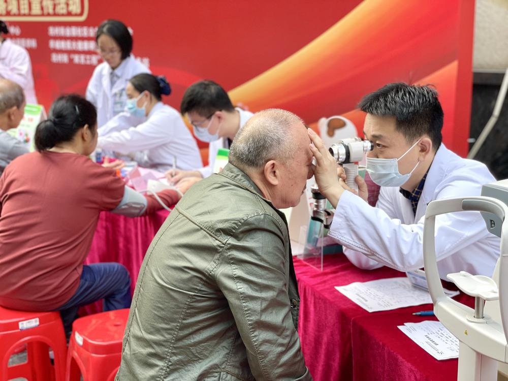 眼健康义诊摊位前也排起了长队。“医生,我最近看东西总是眯着眼睛,能在你这里查下度数,看是不是近视了吗?”来自眼科医院的义诊医生为居民现场答疑解惑,并专门带来了眼部相关检查仪器,免费提供检测服务。